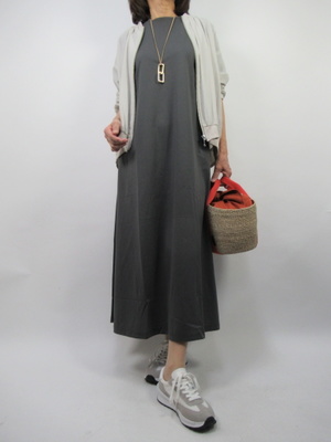 (カットソー生地のワンピースはデイリーにピッタリ)着心地重視のデイリーにはこんなワンピースはいかがでしょう?スニーカーで合わせればデイリーにもピッタリ。ちょーっと歩くのが楽しくなるワンマイルコーデ。