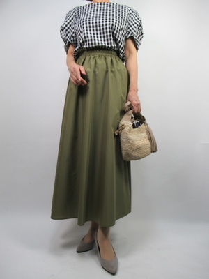 (ギンガムチェックでフェミニンに)黒のギンガムチェック柄のブラウスは袖にボリュームがあるキュートなデザインが特徴。合わせたのはカーキのギャザースカートでフェミニンコーデ。