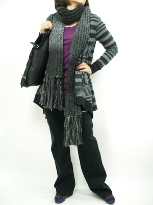 薄い素材を重ね着したら、仕上げはボリュームマフラー。そろそろマフラーのオシャレを楽しみたい季節ですね!アクティブ度100%。