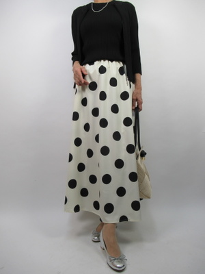 (白×黒モノトーンのコーディネート)コンパクトな黒のリブニット、アンサンブル。伸び感のあるニットなので程よいフィット感でおしゃれに着こなしできる。スカートは白に黒のドットで華やかな印象に。