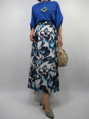 (全身ブルーでまとめたコーディネート)とてもきれいなブルーをメインにスカートの柄とリンクしました。全体にふんわりしたシルエットでエレガントな装いに。