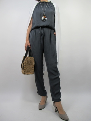 (オールインワンを着る)チャコールグレーのオールインワンに白のロングカーデを羽織ってシンプルコーデ。とろみのある気になのでパンツのシルエットもきれいに落ち感が出てきますね。