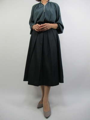 (こんな丈のスカートが欲しかった)ロング丈が多い中このくらいの丈のスカートをお探しの方も多いはず。パールがアクセントなオシャレブラウスをコーデに取り入れて上品なエレガントスタイル。