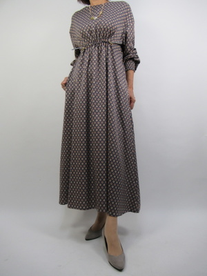 (ロングワンピースでエレガントに)ハイウェスト切り替えがポイントのロングワンピース。小紋柄の落ち着いた生地で柔らかな女らしい装いになる。一枚できちんと感の出るワンピースはお出かけに重宝ですね。