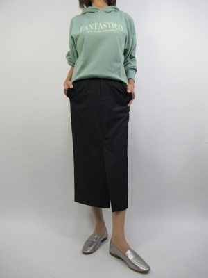 (プルオーバーのパーカにタイトスカートをプラス)カジュアルな印象のパーカにはタイトスカートで大人っぽく着こなすコーデをおすすめ。カジュアルな普段着もハイクラスになる。