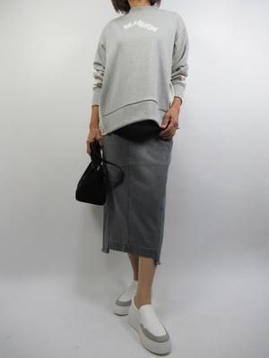 (グレーでまとめるカジュアルコーデ)グレーの濃淡でカジュアルなコーデに仕上げました。トップスは脇にシャツを挟んだ配色が特徴。タイトのデニムで大人のカジュアルコーデが完成。