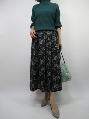 (小花のフェミニンスカートで秋モード)シックな小花柄のフェミニンスカートにスカートの中の一色をトップスにリンクして。秋を感じるスタイリングにしました。ニットはレーヨン素材で肌に優しい一着です。