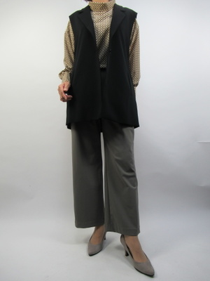 (短丈のジレでコーディネート)ロングのジレがこのところ人気でしたが、このくらいの短丈も少しずつ人気が出てきています。肩幅は広めのテーラード襟。マニッシュな中にブラウスで女らしさを出したコーデ。
