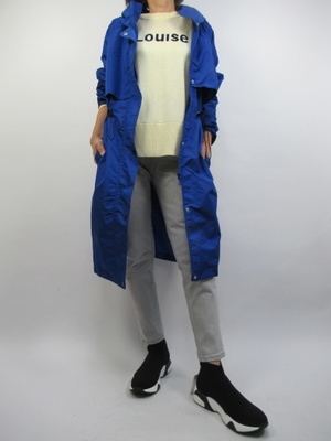 (シャカシャカ生地のカジュアルコート)裏なしのシャカシャカした生地のコートは普段にさっと羽織る感じで用いたい。黄色とブルーのコントラストがとてもおしゃれなデイリーファッション。