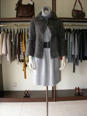 モコモコ感がカワイイカーディガンは、ウエストがギュッとシェイプされているので意外とすっきりしますよ!フェミニン度80%、エレガンス度20%。