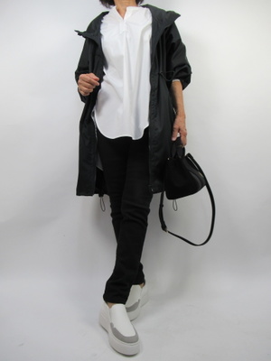 (黒×白で作るカジュアルコーデ)黒と白のコントラストがとてもメリハリを生むコーデ。カジュアルな中に大人っぽい印象を与える。秋のアウトドアに重宝するウィンドブレーカーを重ねてアクティブコーデ。