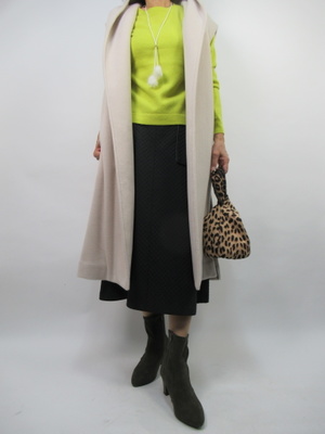 (ハリ感のあるAラインスカートにフリースのジレを合わせて)ハリ感のあるスカートにはコンパクトなニットがとてもバランスが良い。さらにジレを合わせてオシャレなお出かけファッション。