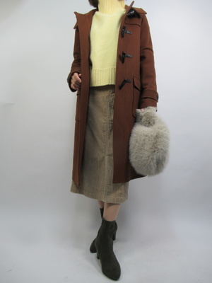 (ダッフルコートで大人可愛く)幼く感じやすいダッフルコートですがタイトスカートでコーデすると大人っぽくそしてフェミニンにスタイリングできます。茶色の中に黄色のニットがアクセントになり素敵ですね。