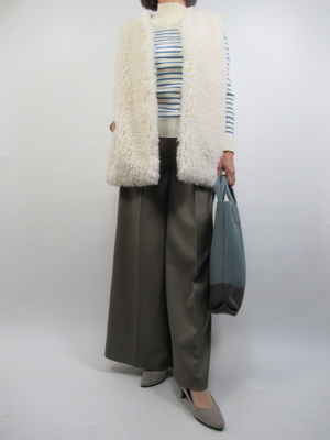 (流行のファージレを着こなす)流行のファージレをご紹介。お尻が隠れるくらいの丈感なのでワイドパンツで合わせてみました。ニットはリブのコンパクトタイプでオシャレなジレコーデ。
