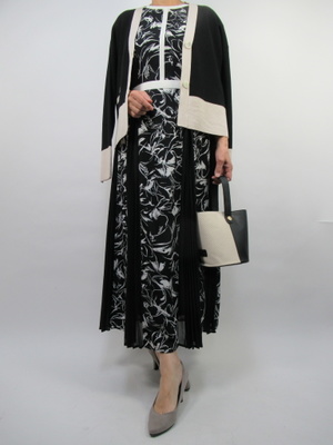 (白×黒のコンビネーションはおしゃれなお出かけスタイル)白×黒のコンビワンピース。スカート部分にはプリーツデザインを取り入れてよりおしゃれに仕上げてます。羽織にも同じ白黒の配色デザインのものを合わせて全体をすっきりとまとめエレガントに。