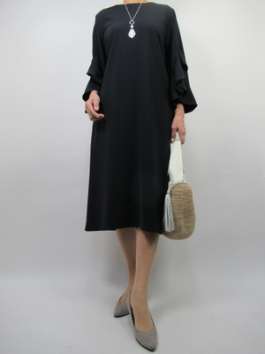 (エレガントなネイビー色のサックワンピース)すとんとしたデザインのワンピースはお出かけにぴったりな一着。春はちょっとしたイベントなども多くなる季節に一着あると重宝ですね。