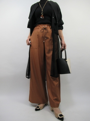 (ソフトワイドパンツでさっそうと)きれい色のワイドパンツに黒を合わせると引き締まった大人のスタイリングになる。羽織ったブルゾンは二枚重ねのおしゃれアイテム。春のスタイリッシュコーデ。