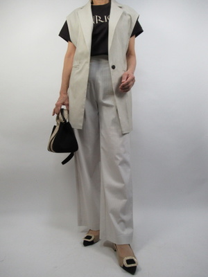 (短丈ジレを着こなす)今年は短丈ジレがおすすめ。ワイドパンツとカジュアルなカットソーにさらっと羽織って今年っぽいスタイリングにまとめました。