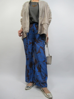 (柄のパンツをおしゃれに)とろみのある生地が特徴の柄パンツ。ざっくりとしたブルゾンを添えて。