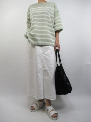 (白のAラインデニム地スカート)Aラインのデニム地スカートは白をチョイス。ざっくりしたニットでカジュアルのあるデイリーファッション。
