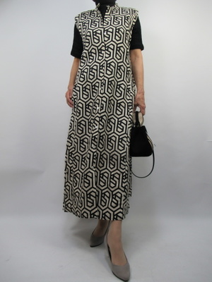 (幾何学模様のワンピース)どこかクラシカルな模様のワンピース。インナーにタートルのカットソーをあわせてお出かけスタイルに仕上げました。