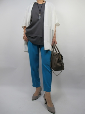 (ざっくりデザインの羽織をきれい色のパンツで)ざっくりデザインの羽織りものをスタイリッシュにコーデ。きれいめカラーのパンツでメリハリのあるコーディネートに。