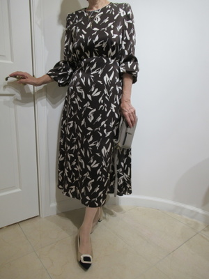 (ワンピースは秋のお出かけに重宝)一枚できちんとエレガントに見せることができるのはワンピースですね。秋を先取りした茶系でシックな秋の装い。
