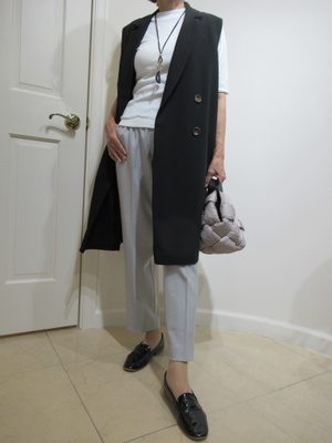 (テーラードのジレファッション)引き続きジレコーデは根強い人気ですね。秋一番もジレファションでスタート。まだ暑いこの時期は半袖カットソーに合わせてスッキリと。