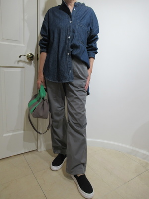 (緩めのベイカーパンツでカジュアルに)ゆるっとしたパンツにおアーバーでざっくりコーデをしてみました。デイリーに気負いなく着こなせるスタイリング。