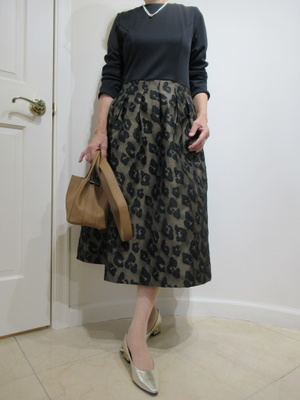 (ドッキングワンピースお出かけに便利)ハリのある生地を使用したスカート部分がエレガントを強調してお出かけにぴったりなワンピース。トップスが黒なのでアクセントにパールのネックレスをポイントに合わせました。