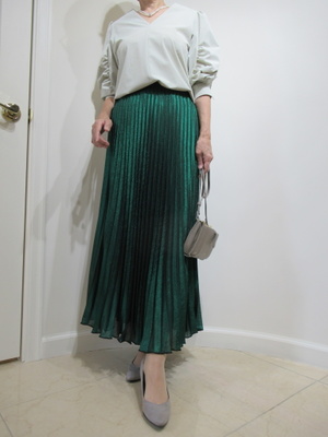 (ラメのおしゃれスカート)アコーディオンプリーツのロングスカートもこんなにキラキラしたラメ生地はとても華やかでおしゃれな一着。トップスはベーシックな色のブラウスでさりげなくコーデ。秋一番のお出かけファッション。