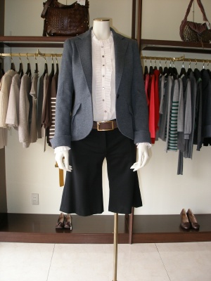 モノトーンでまとめたジャケットスタイルは、きちんとした印象。ベルトなど小物をあえてブラウンにして抜け感を!エレガンス度60%、スタイリッシュ度40%。