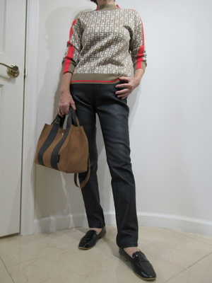 (トレンチ風ジレはスタイリッシュに着たい)ジレコートもトレンチ風の仕立てだとワンランク上のコーデが楽しめますね。ニットはシンプルにパンツは皮革のような光沢のある生地でスタイリッシュにまとめました。