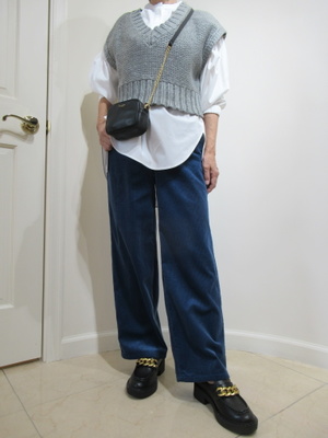 (短丈のトップスは今秋注目です)白のシャツに短丈のトップスをレイヤードコーデ。コーデュロイのパンツでデイリーコーデも今どきにしてみました。