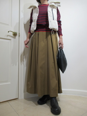 (コンパクトなキルティングベストをプラス)キャメル+ネイビー赤のボーダーニットのフェミニンスタイルで秋をイメージ。チョイスしたベストはコンパクトな丈が今季顔ですね。新スタイルで秋をスタート。