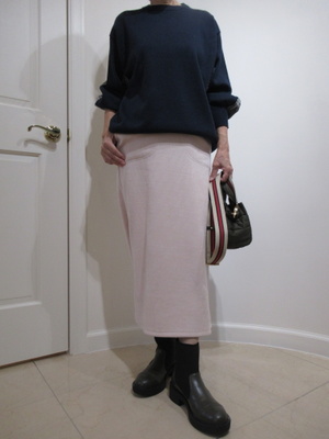 (カジュアルな装いにらくちんスカート)らくちんなスカートは生地がテレコのカットソー地なので穿きやすさ抜群!!おしゃれニットをプラスしたデイリーコーデ。