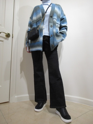 (カーデ+デニムで休日コーデ)ややブーツカットのデニムは穿きやすさが良いデイリーなデニム。さっとは折れるゆったり目のカーデは休日コーデに欠かせない一枚。