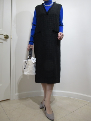 (大人のジャンスカで秋ファッションをエレガントに)黒のシンプルなジャンスカにはブルーのニットを合わせて大人のエレガントコーデにしました。上品な装いは秋のお出かけにピッタリ。