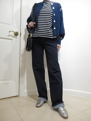 (スポーティな秋にデニムコーデ)今季のデニムはストレートワイド。股上も深く穿きやすい一枚。ボーダーとデザインカーデ秋の休日。お出かけも楽しくなります。