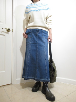 (フェミニンなカジュアルコーデ)デニムスカートはデイリーには欠かせないアイテム。カジュアルニットでシンプルに合わせたデイリーファッション。