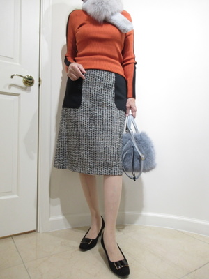 (タートルニットに合うスカート)シンプルなタートルニットは台形スカートとのバランスがとても良い。この上にマフラーでもコートでチョイスすればちょっとしたお出かけも決まりますね。アクセントはファーバッグで。