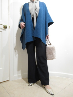 (流行のポンチョで)ソフトワイドなパンツにブラウスインで着こなしてざっくりポンチョを合わせれば今年のポンチョコーデですね。