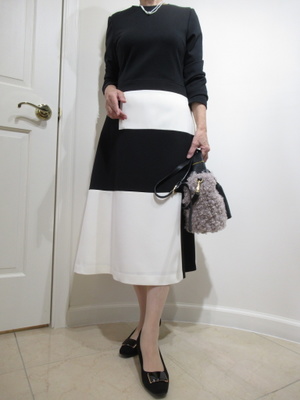 (ツートン配色のシックなワンピース)スカート部分が切り替えの配色使い。段違いの白とくろのデザインがおしゃれ度をアップさせてくれます。12月から1月のお出かけにぴったり。
