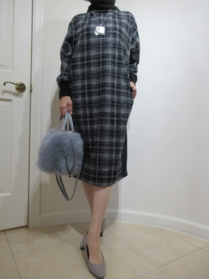 (一枚で絵になるワンピース)チェック柄も黒×グレーのシックな一枚です。コクーンタイプで着やすさもプラスされたお出かけワンピース。生地は冬に向けて暖かい素材です。