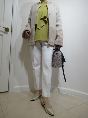 (ショートコートはパンツによく合う)裾周りにボアを配色した可愛くエレガントなショートコート。白のきれいめパンツに合わせれば上品なエレガントスタイルになります。