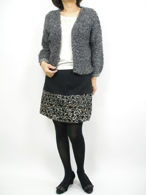 モコモコカーデをバルーンスカートでキュートに着こなして。コンパクトなデザインを選べばバランスも取りやすい!フェミニン度90%、エレガンス度10%。
