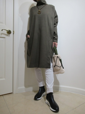 (チュニックワンピースはデイリーの強いアイテム)膝までチュニックワンピースはリボンパンツでざっくり合わせました。あたたかくてデイリーにぴったりなワンピーススタイル。