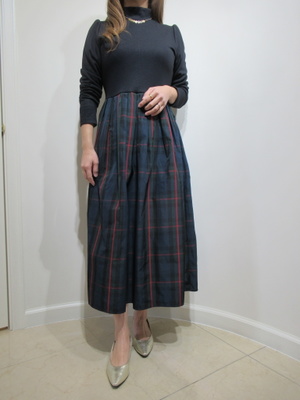 (ドッキングワンピース)スカート部分がチェック柄でトップスは伸縮性のあるカットソー生地なのでとても着心地が良い。一枚できちんとできるワンピースはランチなどのお出かけにぴったり。