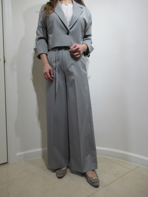 (ショートジャケットのセットアップ)短丈のショートジャケットはワイドパンツとの相性がいい。今までの丈のジャケットにない新鮮なセットアップです。ブラウスでコーデしてエレガントな装いにしてみました。