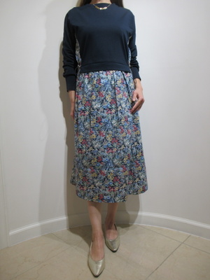(花柄のドッキングワンピース)カットソーと花柄の記事のドッキングワンピースはウェストを紐調整して着用するのが可愛い一枚です。花柄で春の気分ですね。
